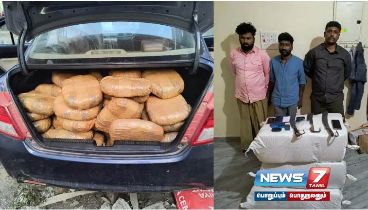 அதன்பேரில், காவல்துறையினர் காரில் கஞ்சா கடத்தி வந்த கிஷோர் (எ) ரஞ்சன் கிஷோர், அசோக் (எ) ஒத்தக்கண் அசோக் மற்றும் உதயகுமார் ஆகிய 3 நபர்களை கைது செய்தனர். அவர்களிடமிருந்து சுமார் 303 கிலோ எடை கொண்ட கஞ்சா, 7 செல்போன்கள், -3 அரிவாள்கள் மற்றும் 2 கார்கள் பறிமுதல் செய்யப்பட்டன.மேலும் விசாரணையில் கைது செய்யப்பட்ட கிஷோர் (எ) ரஞ்சன் கிஷோர் குமார் என்பவர் மடிப்பாக்கம் செல்வம் கொலை வழக்கில் சம்பந்தப்பட்ட குற்றவாளி என்பதும் இவர் நீதிமன்ற விசாரணைக்கு ஆஜராகாமல் தலைமறைவாக இருந்து வந்ததும் தெரியவந்தது. இதனுடன் இவர் மீது 8 குற்றவழக்குகள் நிலுவையில் உள்ளனஇதனைத் தொடர்ந்து அசோக் (எ) ஒத்தக்கண் அசோக் மீது 16 குற்ற வழக்குகள் உள்ளன என்பதும் உதயகுமார் மீது 13 குற்ற வழக்குகள் உள்ளன என்பதும் தெரியவந்தது. கைது செய்யப்பட்ட 3 நபர்களும் விசாரணைக்குப் பின்னர் நீதிமன்றத்தில் ஆஜர் செய்யப்படவுள்ளனர்.