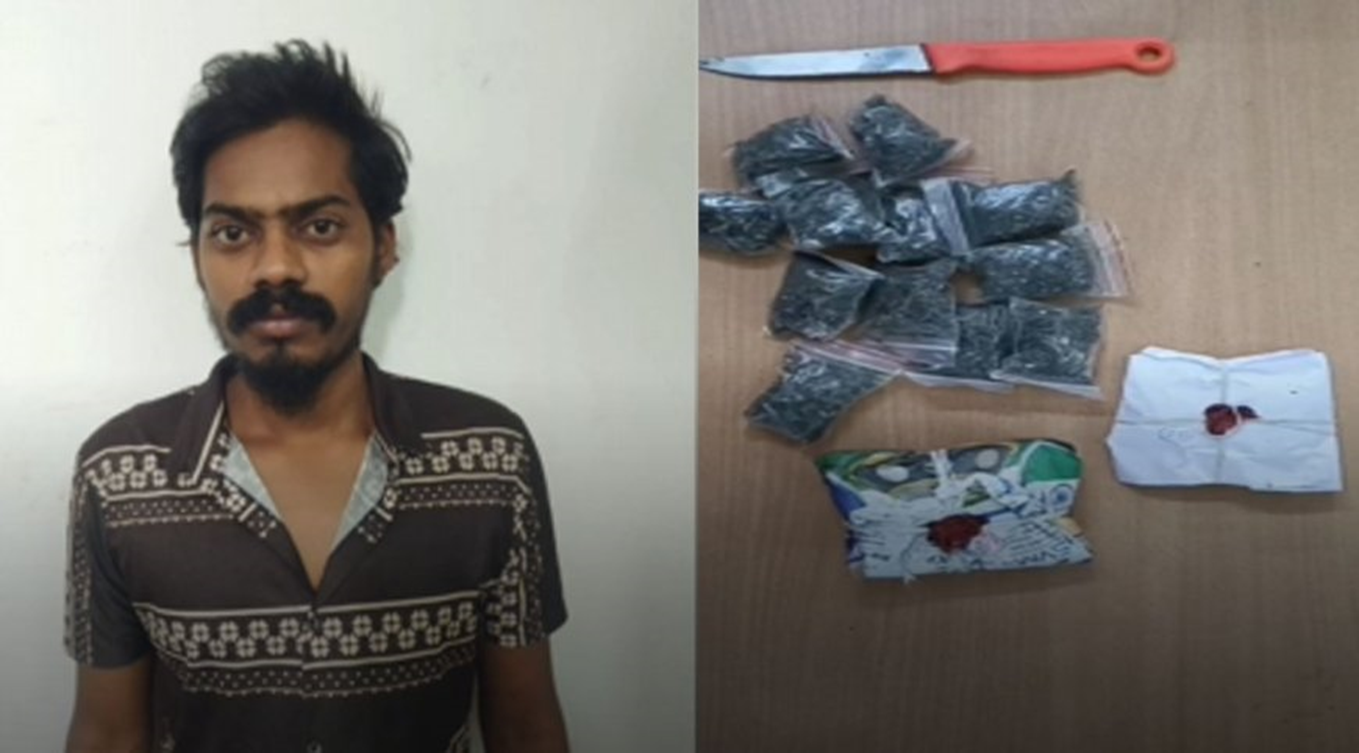 பின்னர் அந்த நபரை சோதனை செய்ததில் 20 கிராம் எடையுள்ள 15 பாக்கெட்டுகளில் கஞ்சா வைத்திருப்பது தெரியவந்தது.அவரிடம் இருந்த கஞ்சா மற்றும் கத்தியை பறிமுதல் செய்த போலீசார் காவல் நிலையம் அழைத்து வந்து விசாரணை செய்ததில் பெரம்பலூர் மாவட்டம் குன்னம் பகுதியைச் சேர்ந்த மணிகண்டன் என்பது தெரியவந்தது.