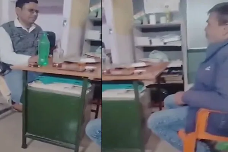 இந்த நிலையில் வழக்கத்திற்கு மாறாக ஆசிரியர்கள் இருவரும் பள்ளி வகுப்பறையிலேயே மது அருந்திக் கொண்டிருந்தனர். இதனை கிராம மக்கள், தனது செல்போனில் வீடியோவாக எடுத்து அந்த வீடியோவை மாவட்ட நீதிபதியிடம் சமர்பித்து புகார் அளித்தனர். சமூக வலைத்தளங்களில் வைரலாகும் அந்த வீடியோவில், மாணவர்கள் முன்னிலையில் வகுப்பறையில் உள்ள ஒரு மேஜையில் இரண்டு தலைமை ஆசிரியர்களும் மதுவை ஊற்றி அருந்துகின்றனர்.