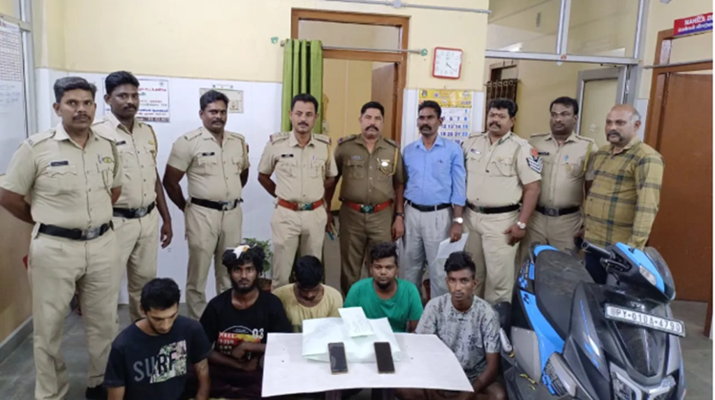 போலீஸ் வருவதை கண்டு தப்பிக்க முயன்றவர்களில் 5 பேர்  போலீஸ் கையில் மாட்டிகொண்டார்கள். அவர்களை விசாரணை செய்ததில் உருளையன்பேட்டை முருகன் கோயில் தெருவை சேர்ந்த அரவிந்த் @ சின்ன அரவிந்த் (22),  பெரியார் நகரை சேர்ந்த சுரேஷ்குமார் (27),  குருசுக்குப்பத்தை சேர்ந்த ரோமி @ ரெமோ (27),  முத்தியால்பேட்டையை சேர்ந்த சசிகுமார் @ பீம் (33) மற்றும் பெரியார் நகரை சேர்ந்த தனுஷ் @ பட்ஜி (20) என தெரியவந்தது.